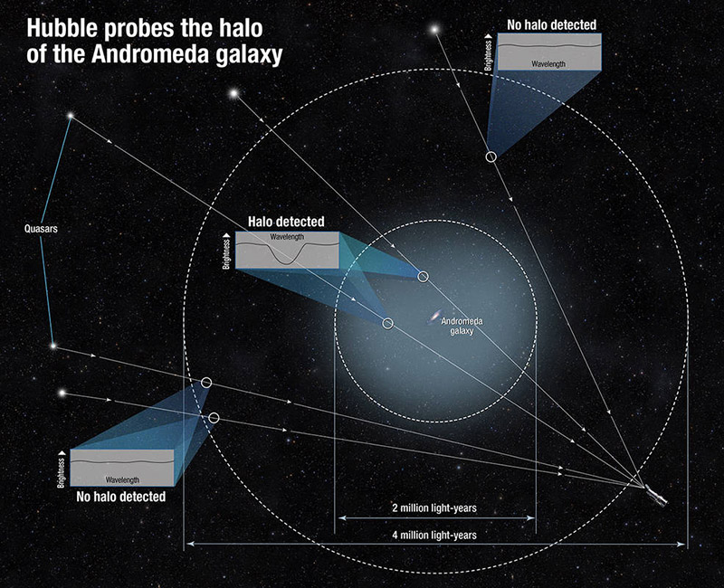 The halo of gas surrounding Andromeda, our nearest galactic neighbor, was probed much in the same way the Milky Way's jets were probed as reported in the February, 2015 edition of All Space Considered. Background quasars were used to see how far out the gassy halo extended (see image below for further explanation) and it turned out to be much larger than anticipated. In previous studies of this sort looking at halos around other galaxies, only one quasar could be used due to the distance of the galaxy and rather small portion of the sky covered as seen from Earth. Because Andromeda is so close, it appears about 6 times the diameter of the moon from Earth. This halo would cover a gargantuan 100 times the diameter of the moon in the sky. That's about half the distance from the Milky Way to Andromeda. If the Milky Way has a similar halo, it could be that the galaxies are already merging on the fringes, long before the main parts of the galaxies merge, roughly 4 billion years from now.